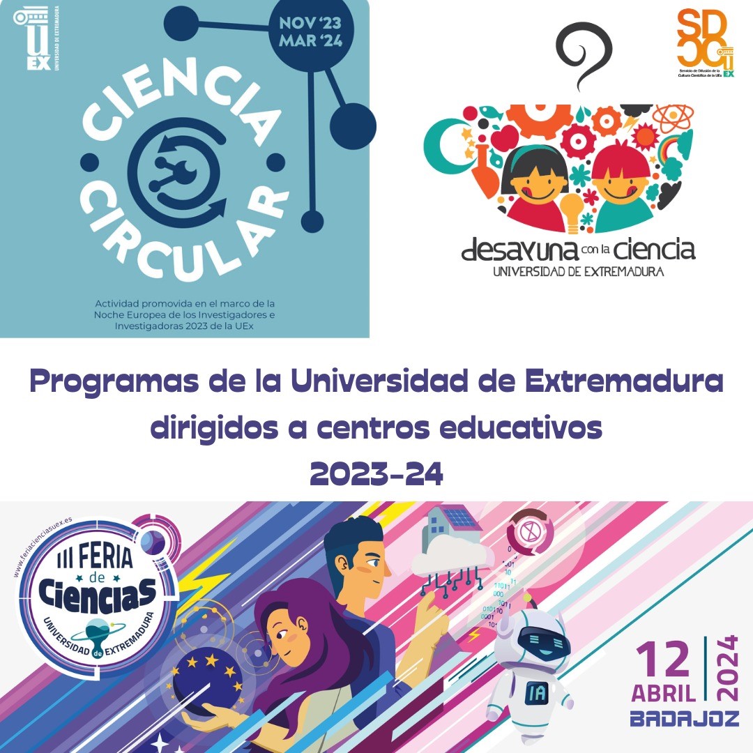 Ciencia Circular, Desayuna con la Ciencia+Cultura Emprendedora y Feria de Ciencias. Universidad de Extremadura son tres de los programas que organiza el Servicio de Difusión de la Cultura Científica que pretenden acercar la ciencia y la tecnología al alumnado no universitario
