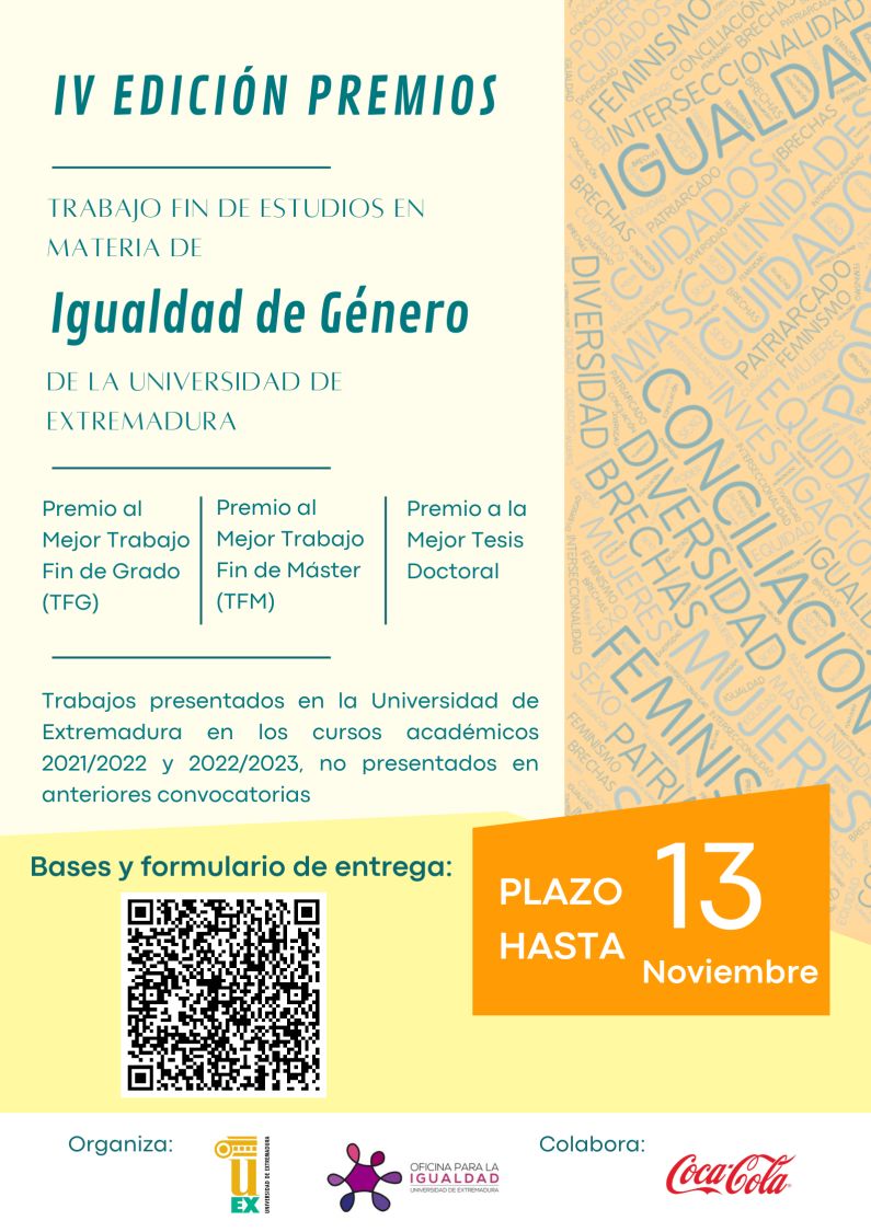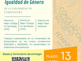 30/10/2023. La Oficina para la Igualdad convoca los IV Premios a los mejores trabajos fin de estudios (Trabajo de Fin de Grado, Trabajo Fin de Máster y Tesis Doctoral) presentados en la Universidad de Extremadura, en cualquier rama de conocimiento, con perspectiva de género y/o que hayan incorporado el género como categoría de análisis.