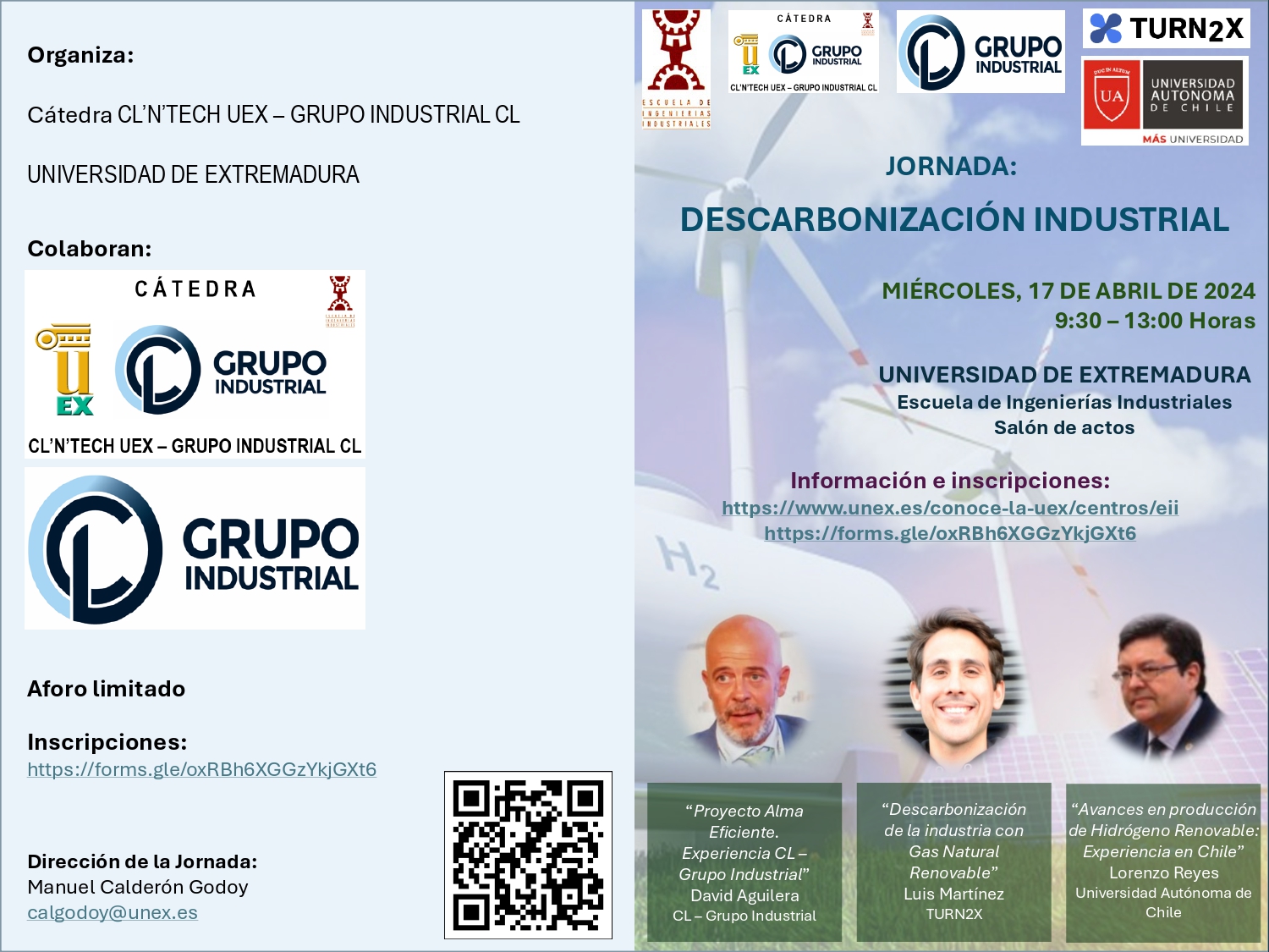 El pasado miércoles 17 de abril tuvo lugar en la Escuela de Ingenierías Industriales de la UEx, la I Jornada sobre Descarbonización Industrial, organizada por la Cátedra CL´N´ TECH UEx- Grupo Industrial CL en el marco de la transición energética y la economía sostenible. A la conferencia asistieron 60 personas, entre las que se encontraban tanto universitarios, como profesionales del sector industrial