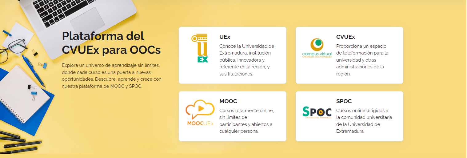 10/07/2024. El Vicerrectorado de Transformación Digital de la Universidad de Extremadura (UEx) ha lanzado una nueva plataforma dedicada a albergar cursos online abiertos (OOCs, Open Online Courses), reafirmando así su compromiso con la difusión y transferencia del conocimiento. Desarrollada por el Campus Virtual de la UEx, esta plataforma ofrece cursos en formatos MOOC (Massive Open Online Courses) y SPOC (Small Private Online Courses).