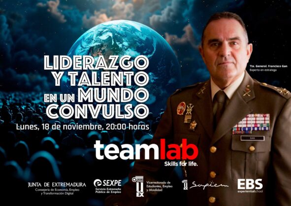 18/11/2024. El Vicerrectorado de Estudiantes, Empleo y Movilidad, por medio de SAPIEM, el Servicio de Apoyo a la Iniciativa Emprendedora, dentro del programa TEAMLAB 2024, ofrecerá hoy lunes 18 de noviembre a las 20:00 horas un seminario online a cargo del analista internacional y Teniente General, Francisco Gan Pampols, bajo el título ‘Liderazgo y Talento en un mundo convulso’.