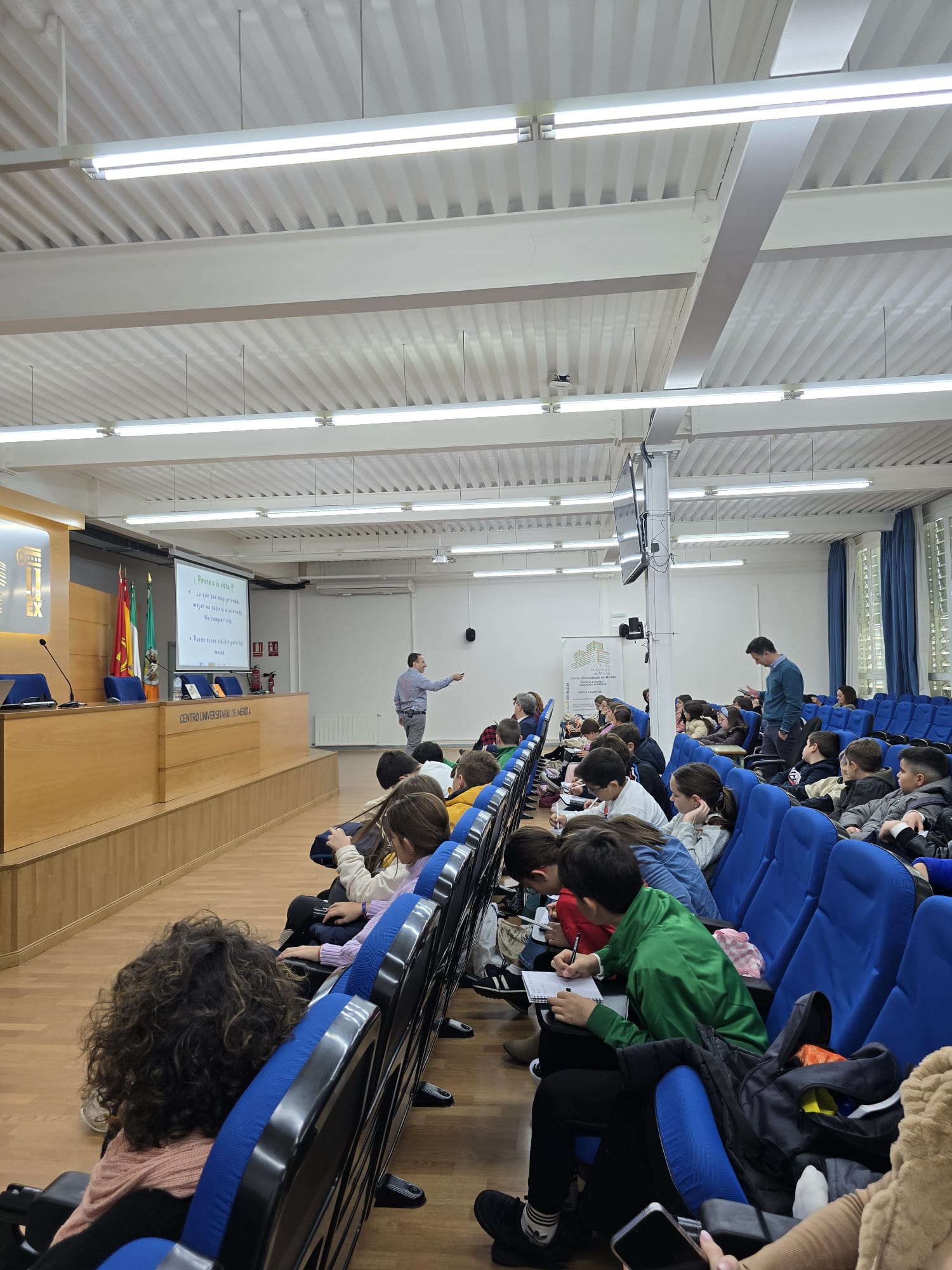 27/11/2024. Esta mañana ha comenzado en el Centro Universitario de Mérida la primera cita de las Jornadas “Ciber#Reto. Privacidad y buen rollo online” destinadas al alumnado de 5º y 6º de Primaria, en el que a través de talleres y actividades se da a conocer los riesgos que existen en Internet y cómo prevenirlos, para que aprendan a valorar su privacidad en Internet y a respetar a aquellos que también están detrás de la pantalla. Además, se enseña el uso correcto de los videojuegos y los riesgos que existen.